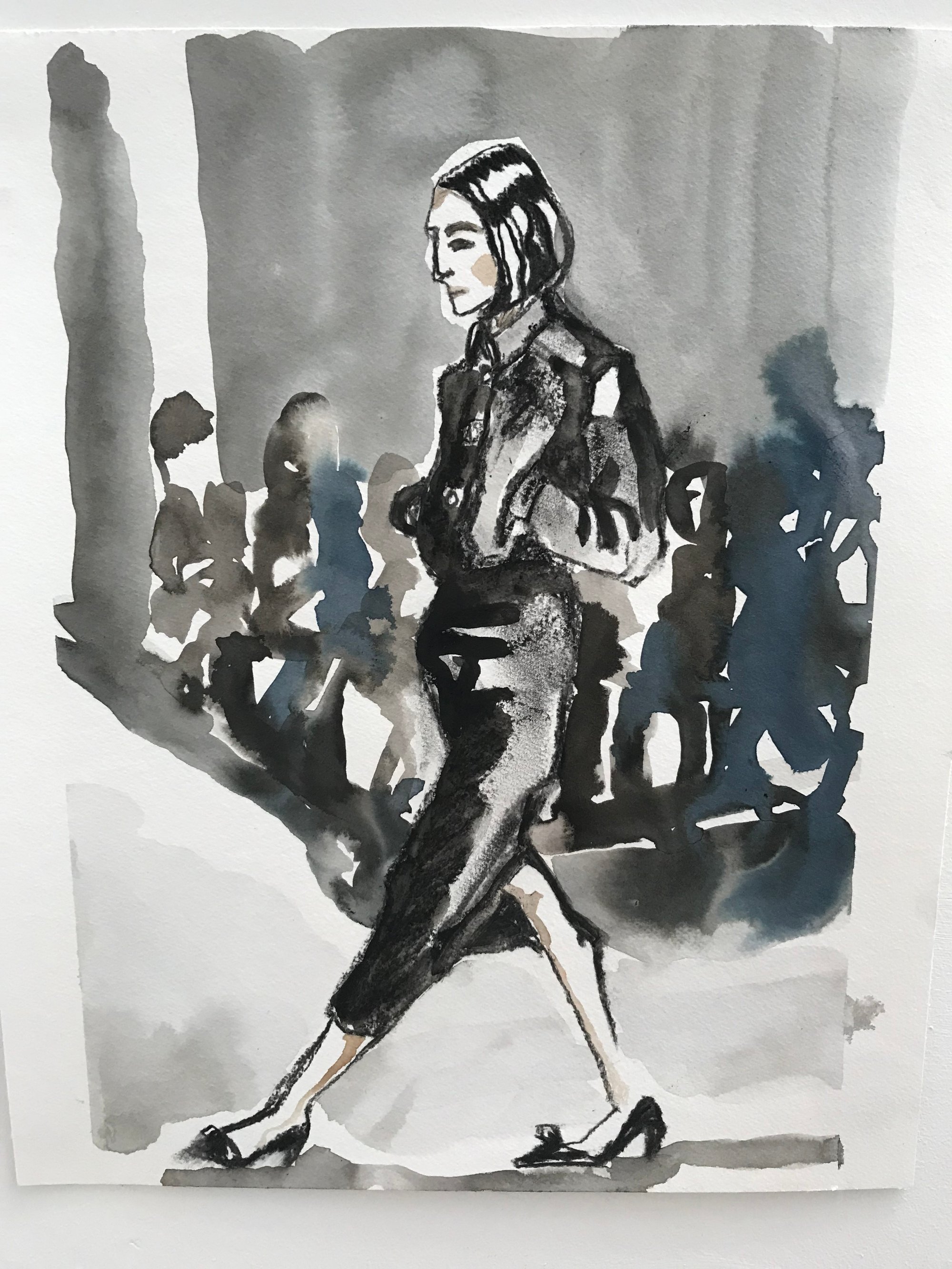 Prada catwalk original illustration by Tracey Smith available as an A5 Artcard with envelope. A5 Artcard is a large flat postcard style (not greetings card style) which can be used as a greeting card or framed as an artwork. Please note that the A5 Artcard envelope colours may vary.