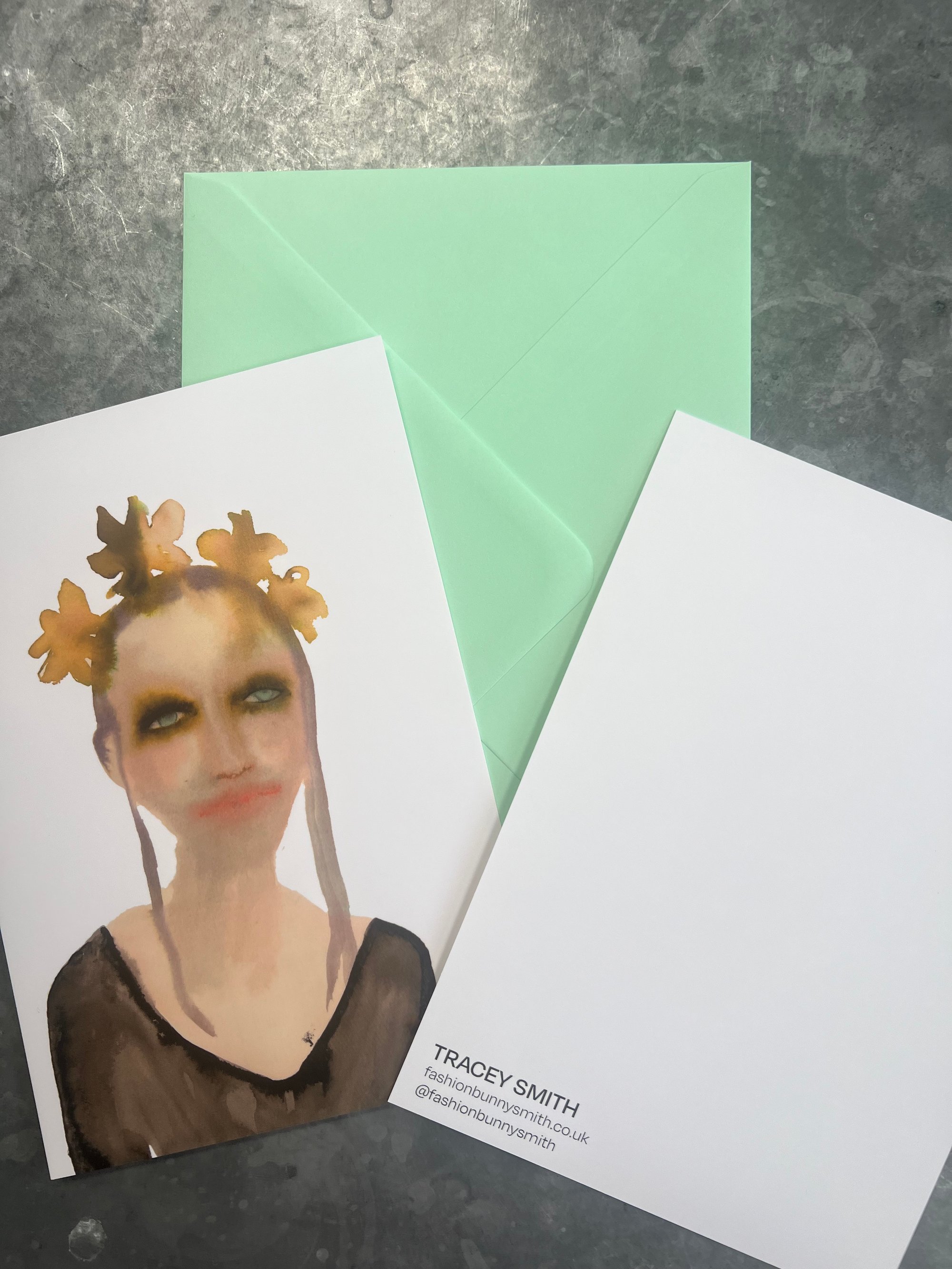Inky face 'Ophelia' original artwork by Tracey Smith available as a fine art A4 giclee print on Hahnemuhle German Etching paper 300g (unframed) which looks and feels like the original artwork, and also as an A5 Artcard with envelope. A5 Artcard is a large postcard style which can be used as a greeting card or framed as an artwork. Please note that the A5 Artcard envelope colours may vary.