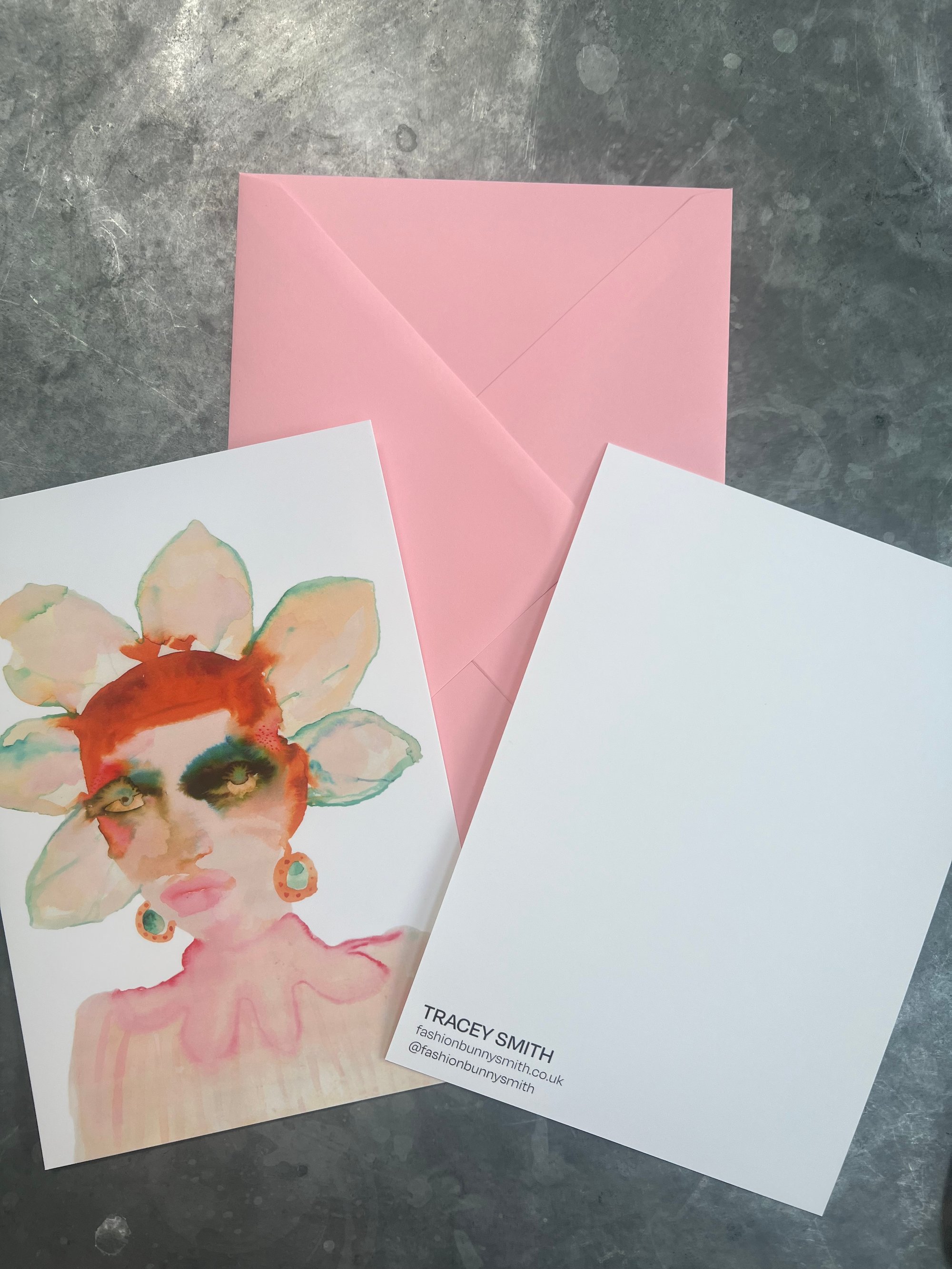 Inky face 'Viola' original artwork by Tracey Smith available as a fine art A4 giclee print on Hahnemuhle German Etching paper 300g (unframed) which looks and feels like the original artwork, and also as an A5 Artcard with envelope. A5 Artcard is a large postcard style which can be used as a greeting card or framed as an artwork. Please note that the A5 Artcard envelope colours may vary.